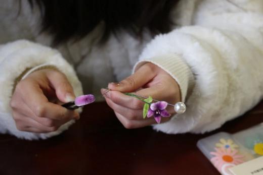 在令人期待的绒花制作体验环节,邀请到来自江苏省工艺美术大师、江苏省非遗绒花代表性传承人赵树宪老师工作室的两位老师为大家进行授课指导。老师们仔细示范,同学们踊跃尝试。大家神情专注,纤细的黄铜丝在手中逐渐勾勒出花瓣的轮廓,柔软的蚕丝绒条被精心整理成栩栩如生的花朵形状。
