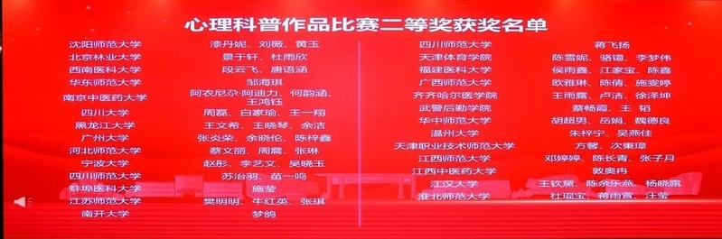 2024年全国应用心理专业学位研究生实践技能大赛(决赛)于12月8日在华中师范大学举行。我院应用心理专业硕士研究生阿衣尼尕·阿迪力、何韵涵、王鸿钰组成的团队荣获心理科普作品赛道全国二等奖。