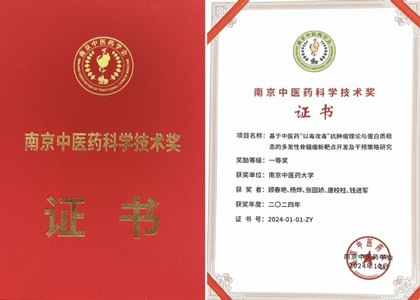2025年1月19日上午,南京中医药学会举办第十二届六次理事会扩大会,会议对第六届南京中医药科学技术奖获奖专家团队予以表彰并颁发证书,必赢线路检测3003no1顾春艳/杨烨教授团队完成的《基于中医药“以毒攻毒”抗肿瘤理论与蛋白质稳态的抗多发性骨髓瘤药物新靶点发现及干预策略研究》项目荣获第六届南京中医药科学技术奖一等奖。获奖成员为:顾春艳、杨烨、张园娇、唐校柱、钱进军。