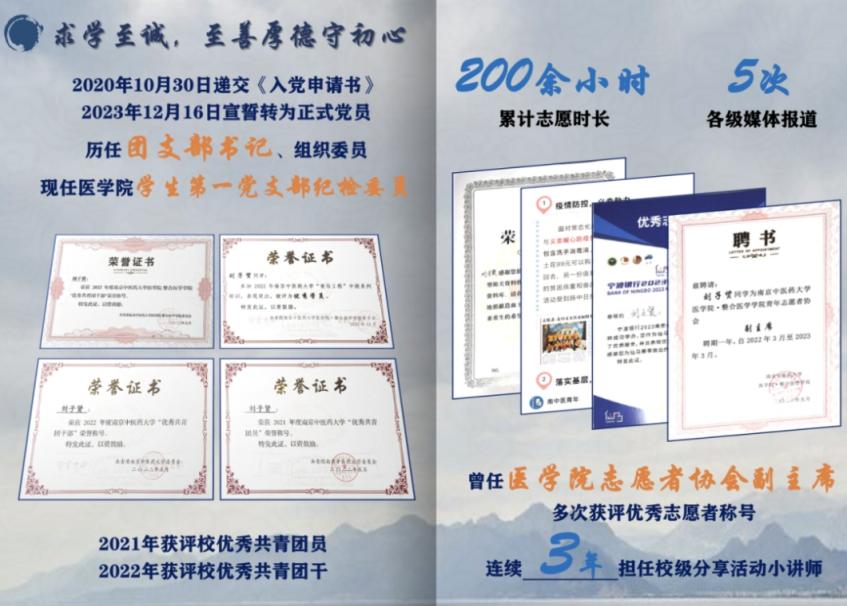 秉“学贯中西,至精至诚”,求“突破进取,全面发展”。刘子贤同学在学业、科创、学生工作、志愿实践、体育运动等各方面辛勤耕耘,脚踏实地,志存高远,在青春的征程上奋勇前进,谱写属于新时代医学学子的崭新篇章!