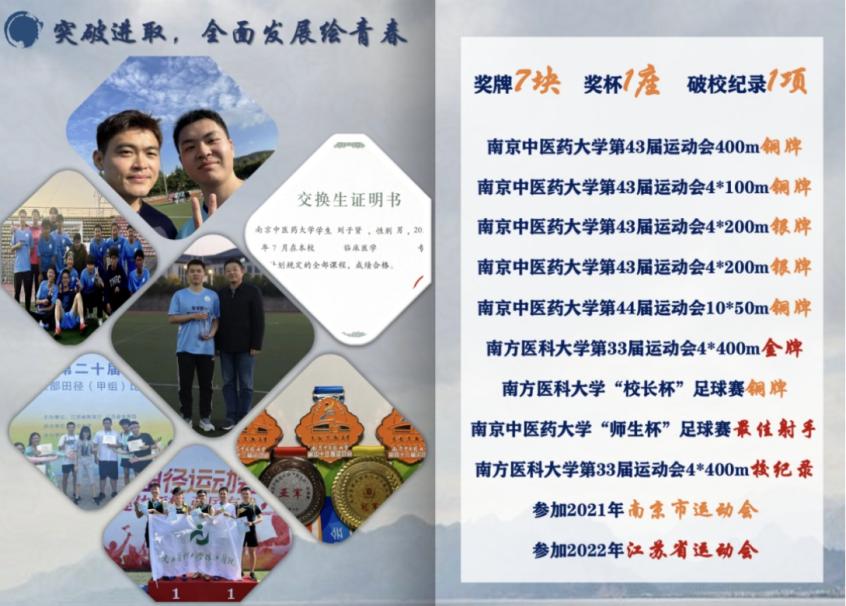 文明其精神,野蛮其体魄。作为校田径队的一员,他代表学校参加了第二十届江苏省运动会和南京市运动会。在校运会中,他已累计获得五枚奖牌。在南方医科大学期间,斩获金牌一枚,并打破校纪录。此外,他曾获南方医科大学足球院赛季军、南中医师生杯足球赛“最佳射手”等荣誉。