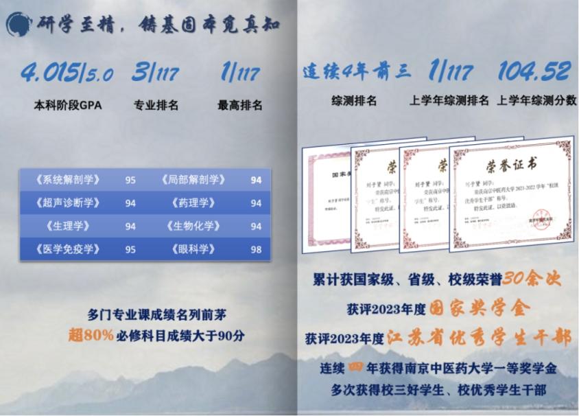 研学至精,学校的每一个角落都留下了他学习的身影。四年以来,他时刻激励自己刻苦钻研学业,奋力夯实医学基础,诸多专业课程取得高分。本科期间平均绩点排名专业第三,学年平均绩点最高排名专业第一。流水争先,更争滔滔不绝。他连续四年综测排名专业前三,上学年排名专业第一。