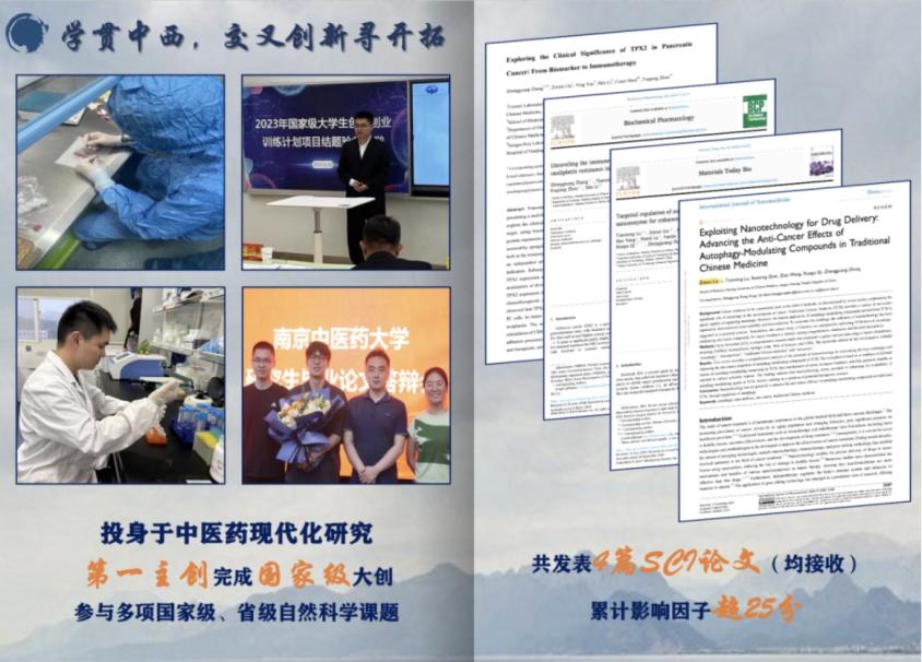 他积极投身中医药现代化研究,自大二暑期起他便跟随学院齐若谷教授开始了在实验室的学习。在此期间,他参与了多个研究项目,共发表SCI论文4篇,累计影响因子超25分。其中以第一作者发表一篇中科院二区SCI文章,IF=8.0;以共同第一作者发表一篇中科院一区SCI文章,IF=8.7分。在齐若谷教授和张正光老师的指导下,他作为第一主创负责了一项国家级大学生创新创业项目,并顺利结题。