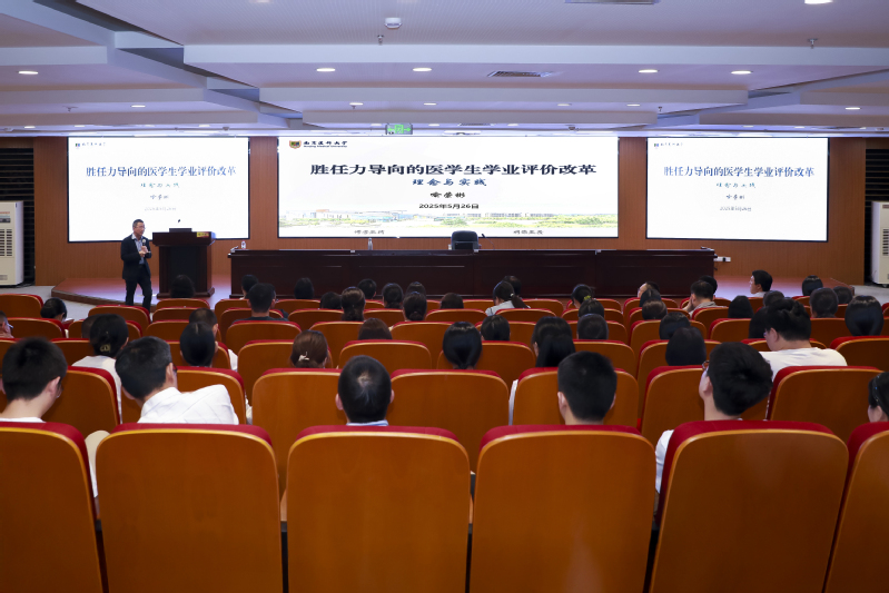动员会后,南京医科大学教务处处长喻荣彬教授以《胜任力导向的医学生学业评价改革的理念与实践》为主题作专题报告。喻教授结合国内外医学教育趋势,系统阐释了从“知识考核”向“能力评估”转型的核心理念,并分享了南京医科大学在过程性评价、临床技能考核、多站式考试(OSCE)等方面的创新实践。高等教育质量评估和研究中心副主任孙荪在总结讲话中强调了学业评价对教学改革的重要意义,希望学院要以认证为契机,推动专业建设再上新台阶。