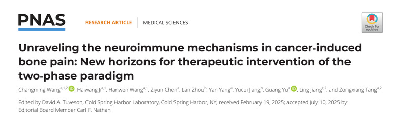 2025年 8月19 日,我校唐宗湘教授、王长明教授及江苏省肿瘤医院姜玲团队在《Proceedings of the National Academy of Sciences of the United States of America》(PNAS,中科院医学一区)发表题为 “Unraveling the neuroimmune mechanisms in cancer-induced bone pain: New horizons for therapeutic intervention of the two-phase paradigm” 的最新研究成果,揭示了癌症诱导骨痛(CIBP)的双阶段神经免疫调控机制,为不同病程的癌痛精准干预提供了全新靶点。