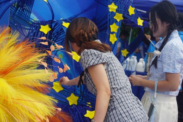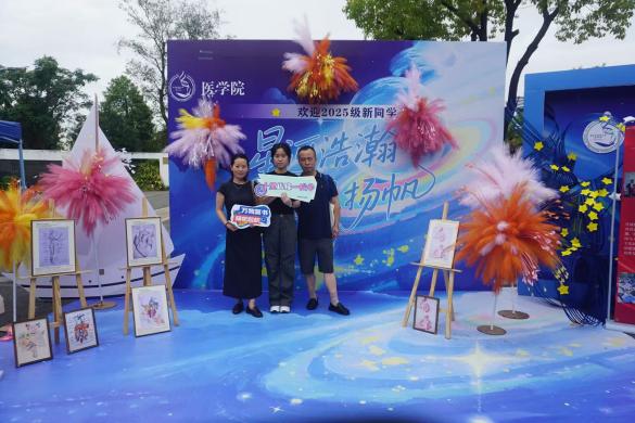 体育馆外场,“星河浩瀚,梦想扬帆”主题置景格外吸睛。璀璨的“烟花”下,新生们纷纷拿起笔,将对大学的愿景和对医学的向往写在“星星”卡片上,再小心翼翼粘贴到“星河”之上。这一条条汇聚梦想的“星河”,不仅是青春的见证,更预示着他们将在医学的知识宇宙中扬帆启航、乘风破浪。