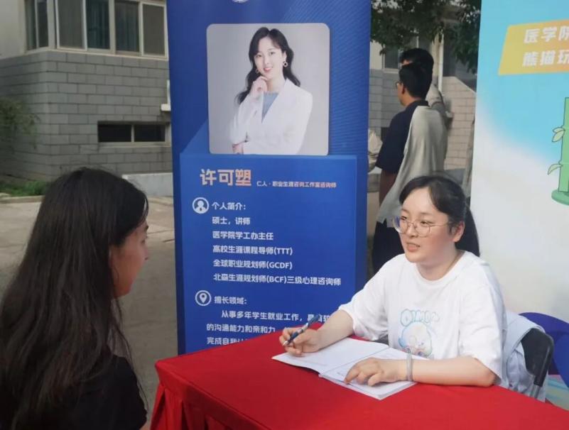 学院学工办主任、高校生涯课程导师许可塑老师特别开设了“职业发展咨询角”,为同学们提供一对一的职业生涯规划辅导。许老师结合临床、科研、健康管理、创业等多个职业发展维度,系统帮助学生分析个人优势与职业适配性。通过这种全面而深入的职业生涯规划辅导,同学们能够更清晰地认知自身特质与职业倾向,从而做出更具前瞻性的学业职业规划选择,为未来的职业生涯奠定坚实的基础。